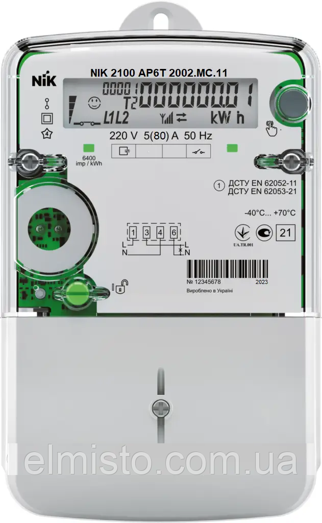 Лічильник електроенергії НIК 2100 AP6T.2002.MC.11 5-60 А багатотарифний, з реле керування навантаженням (вимкнення споживача), індикація впливу радіополей, ЖКИ, релейний вихід, призначений для вимірювання електричної активної енергії, а також організації багатотарифного обліку в однофазних ланцюгах змінного струму.