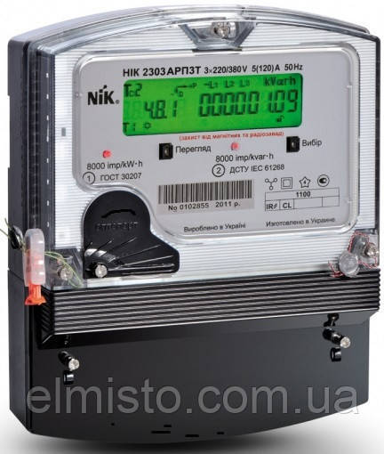 Електрообчисник НИК 2303 АП1Т (NIK 2303 AP1T) трифазний чотиритарифний лічильник активної енергії прямого увімкнення. Номінальний струм — 5 А, максимальний струм — 100А.